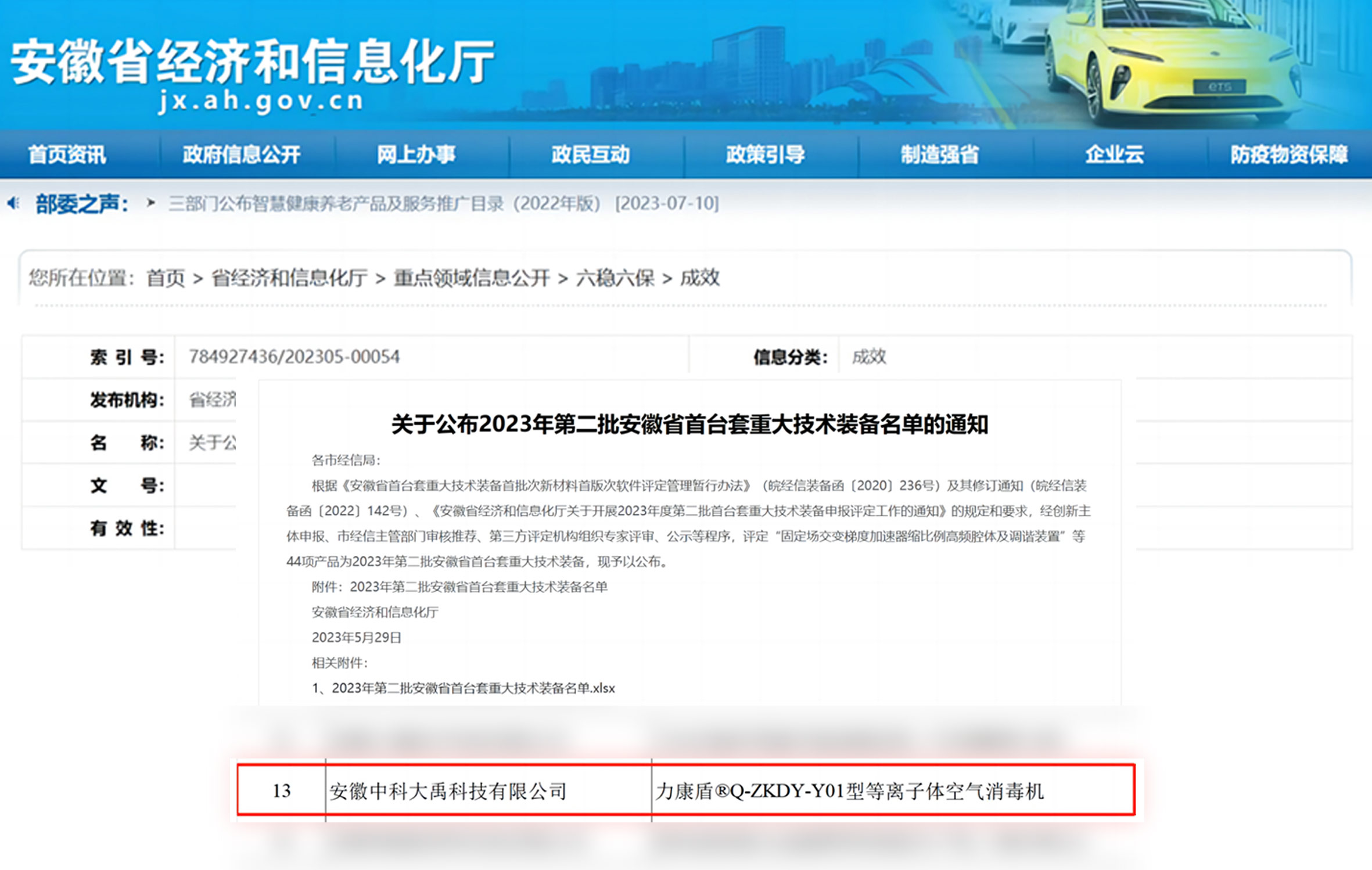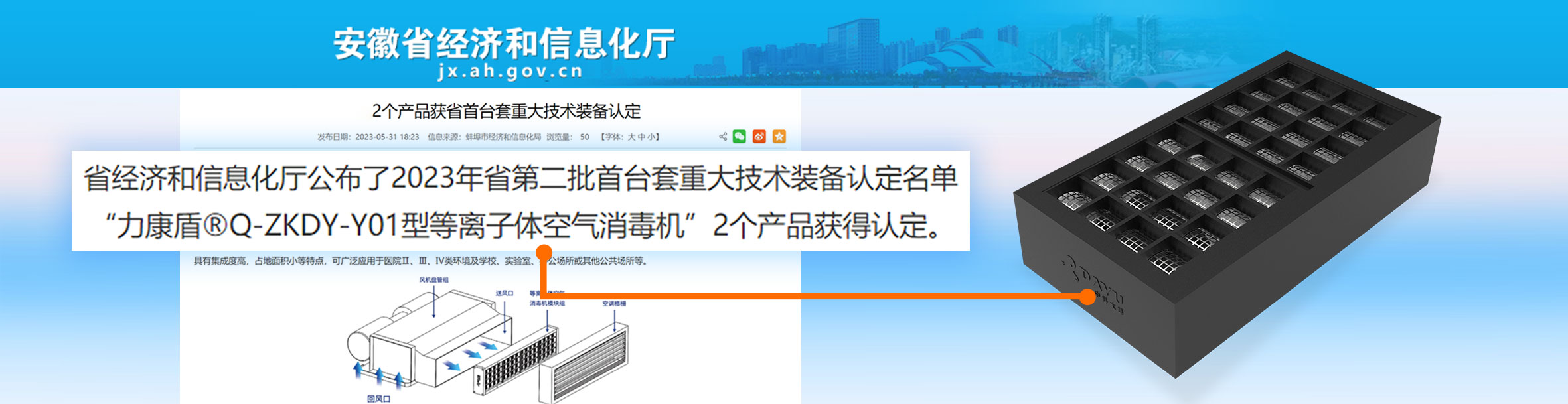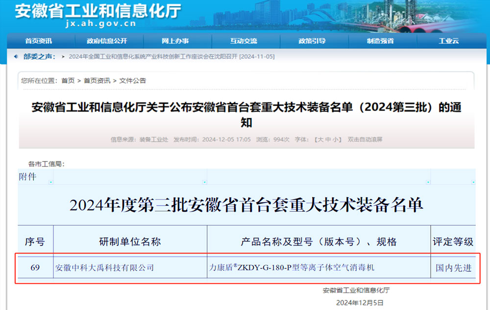力康盾?ZKDY-G-180-P型等離子體空氣消毒機入選2024年度第三批安徽省首臺套重大技術(shù)裝備,評定等級:國內(nèi)先進