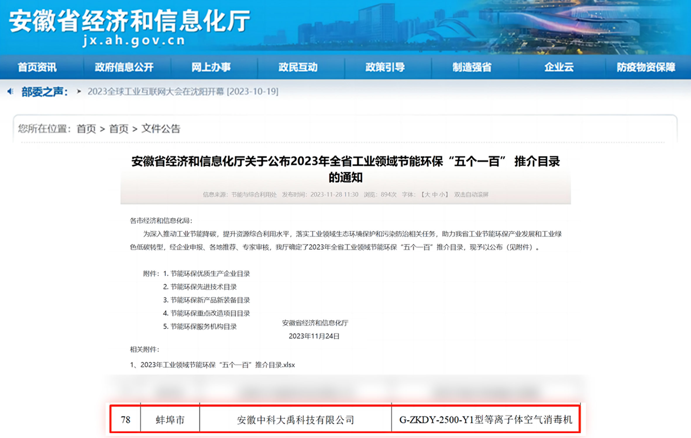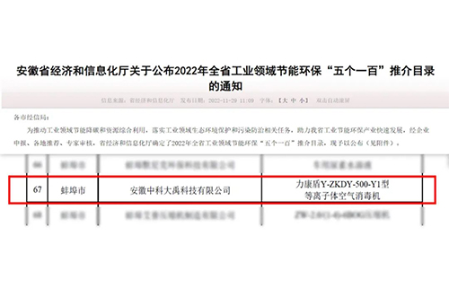 入選2023年全省工業(yè)領域節(jié)能環(huán)保“五個一百”推介目錄(節(jié)能環(huán)保新產(chǎn)品新裝備:G-ZKDY-2500-Y1型等離子體空氣消毒機)